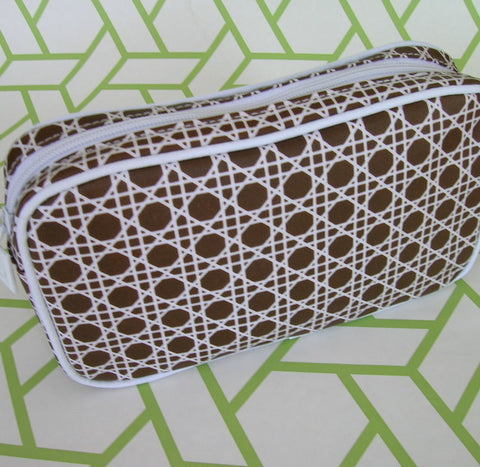 Brown caning design on coated canvas with inside lining. 8 1/2” x 2 1/2” x 5”
