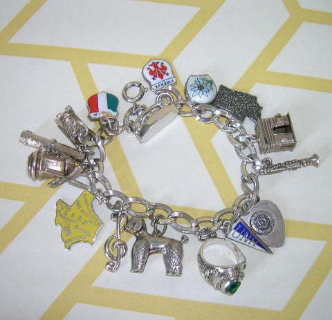 Sterling silver bracelet with 16 beautiful charms from around the world. Please call or email for details. Sorry but item is one of a kind and not returnable.